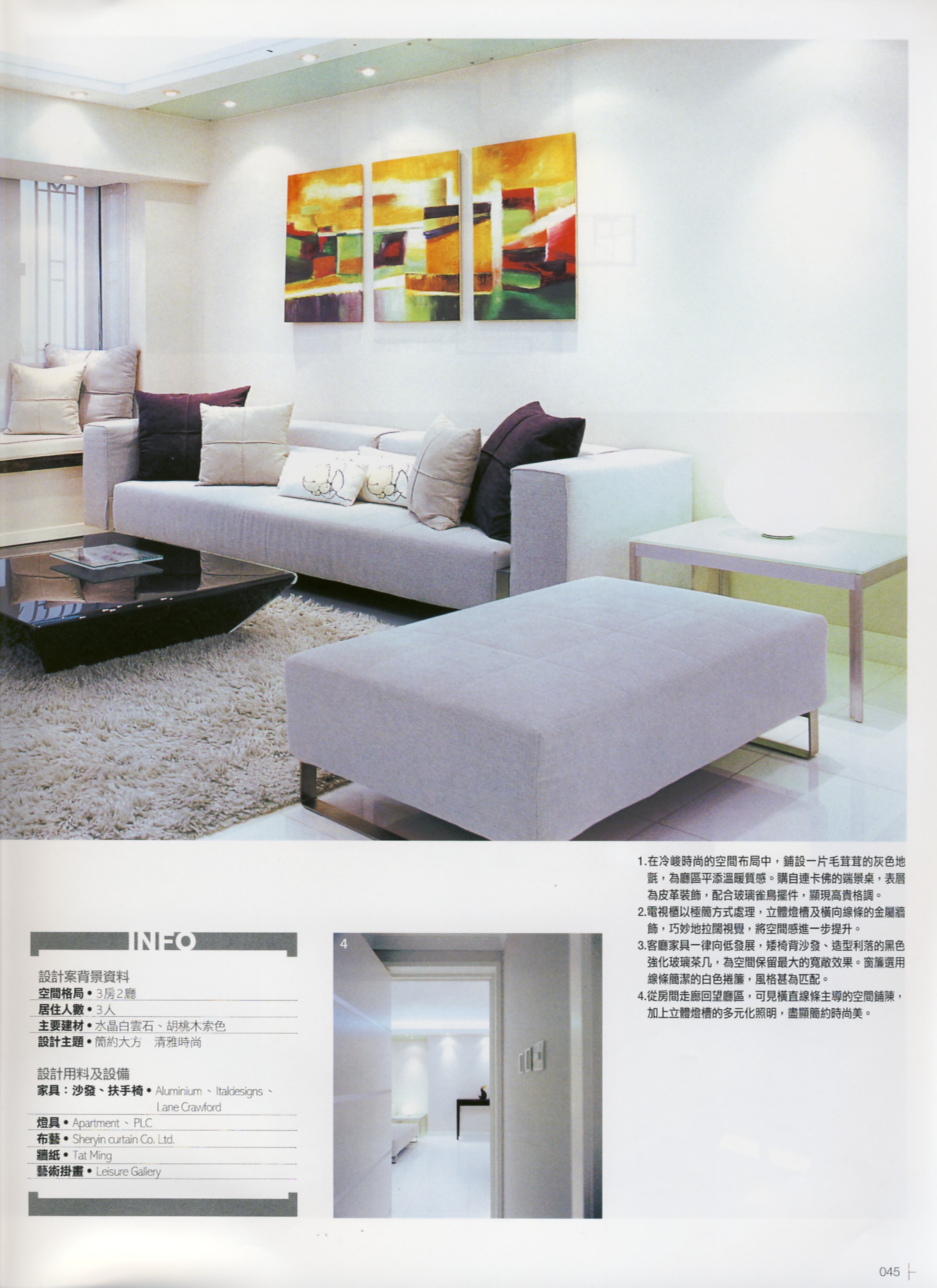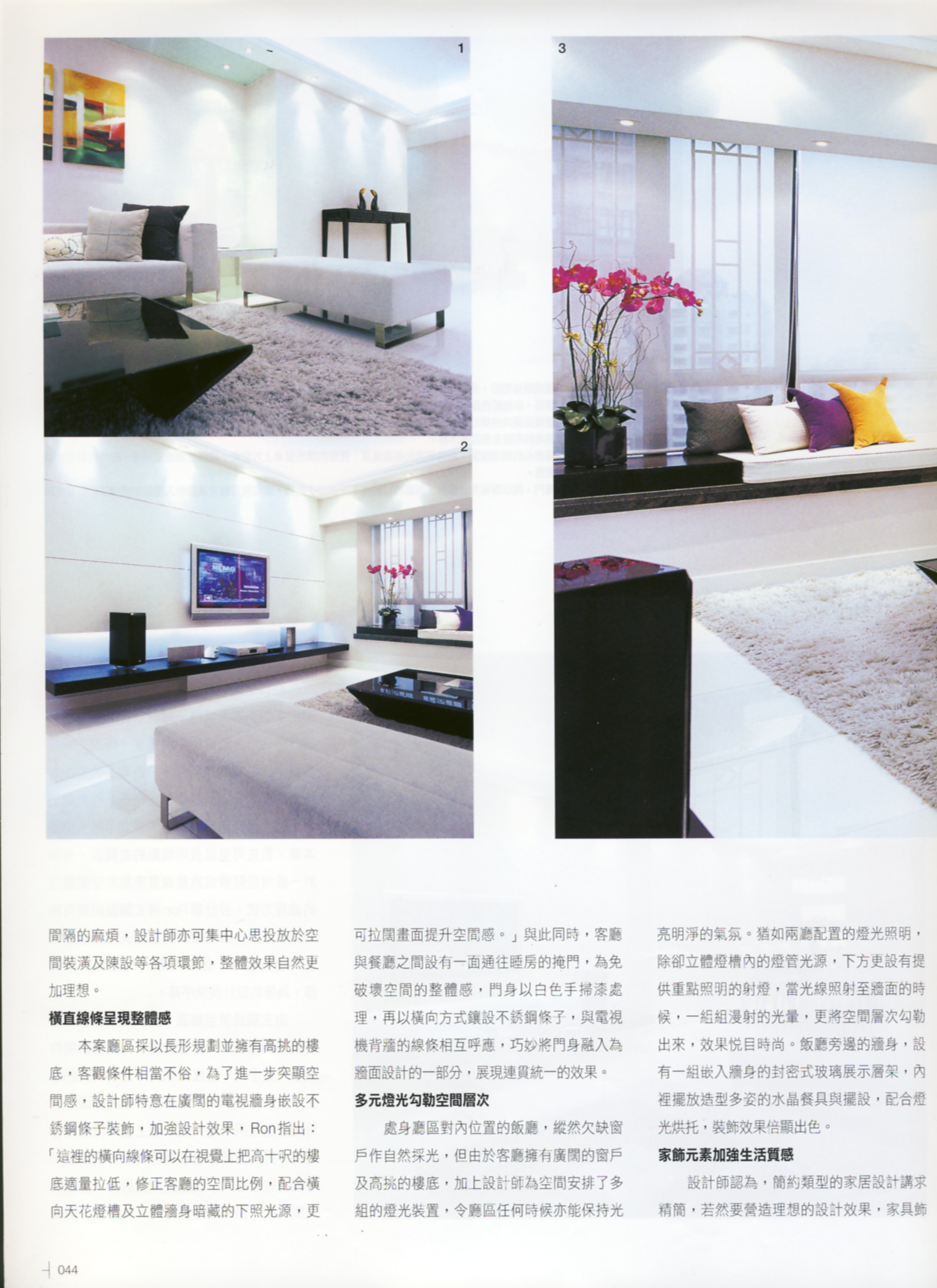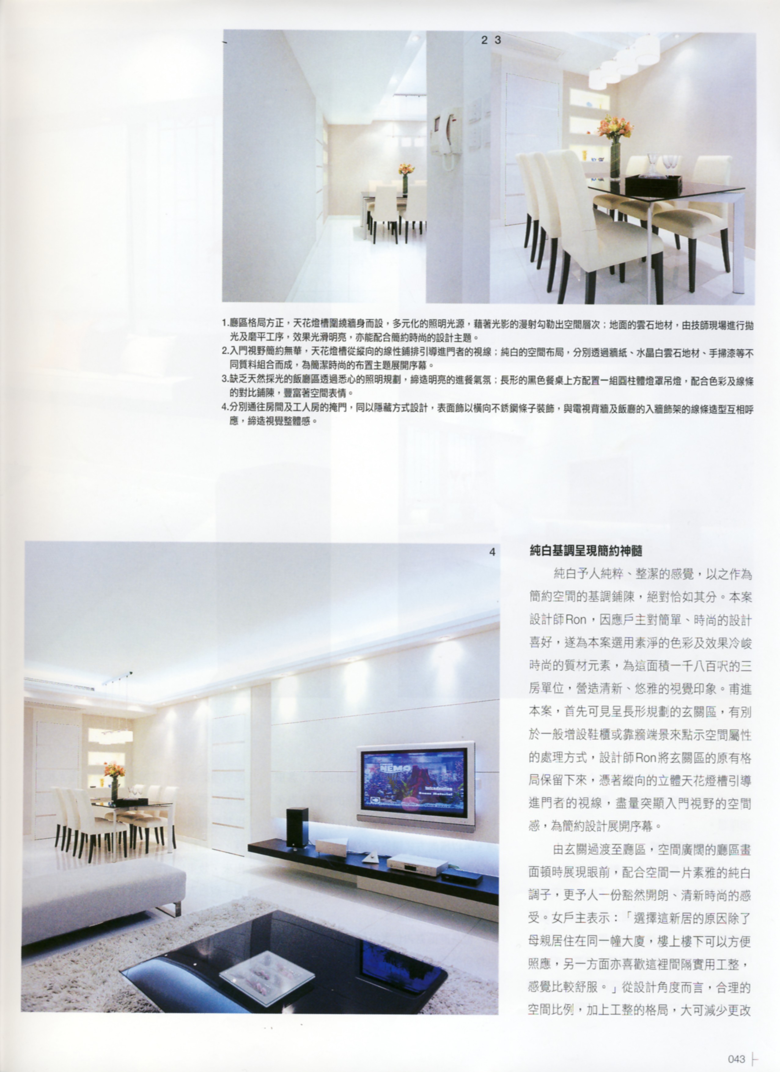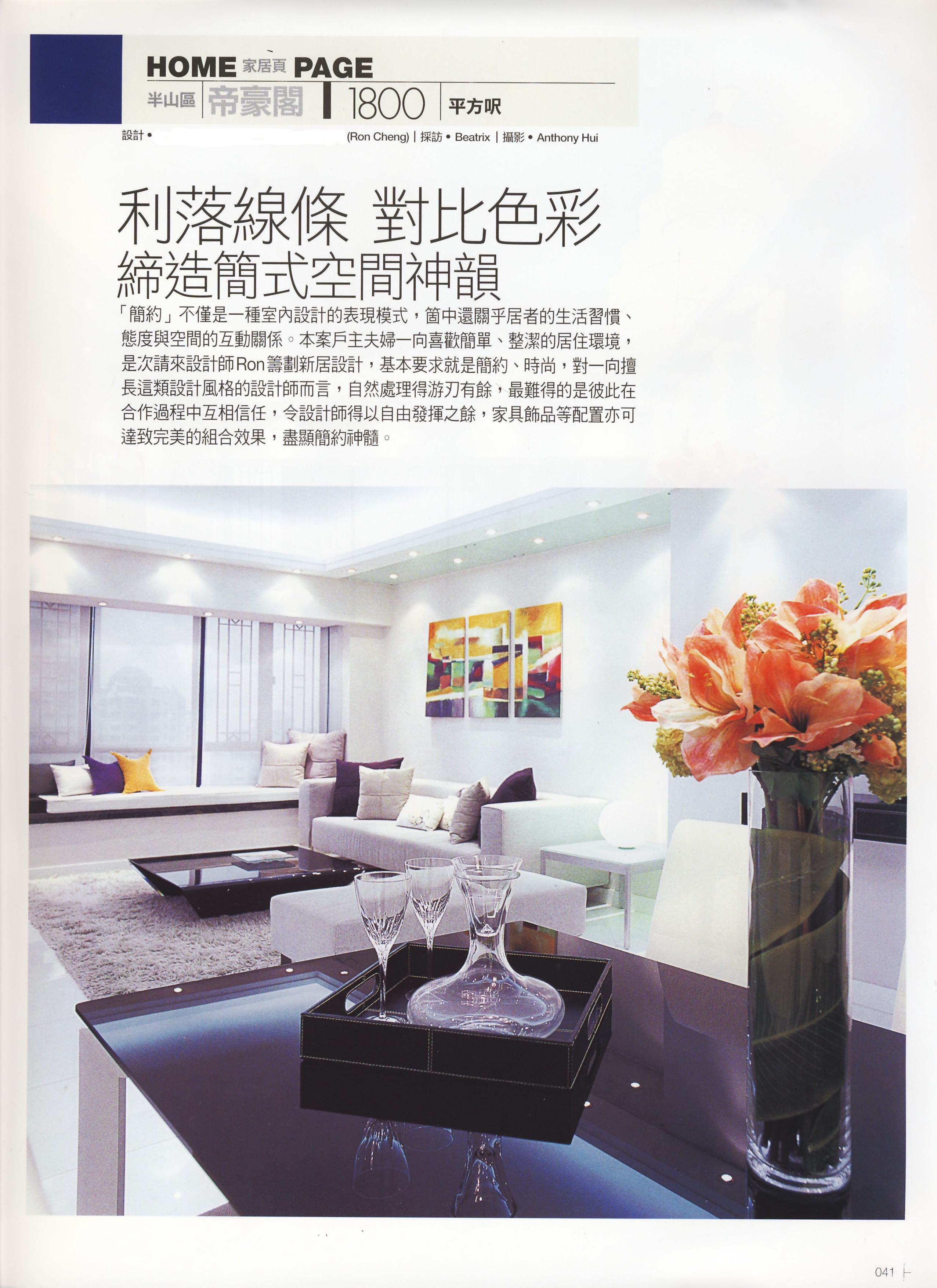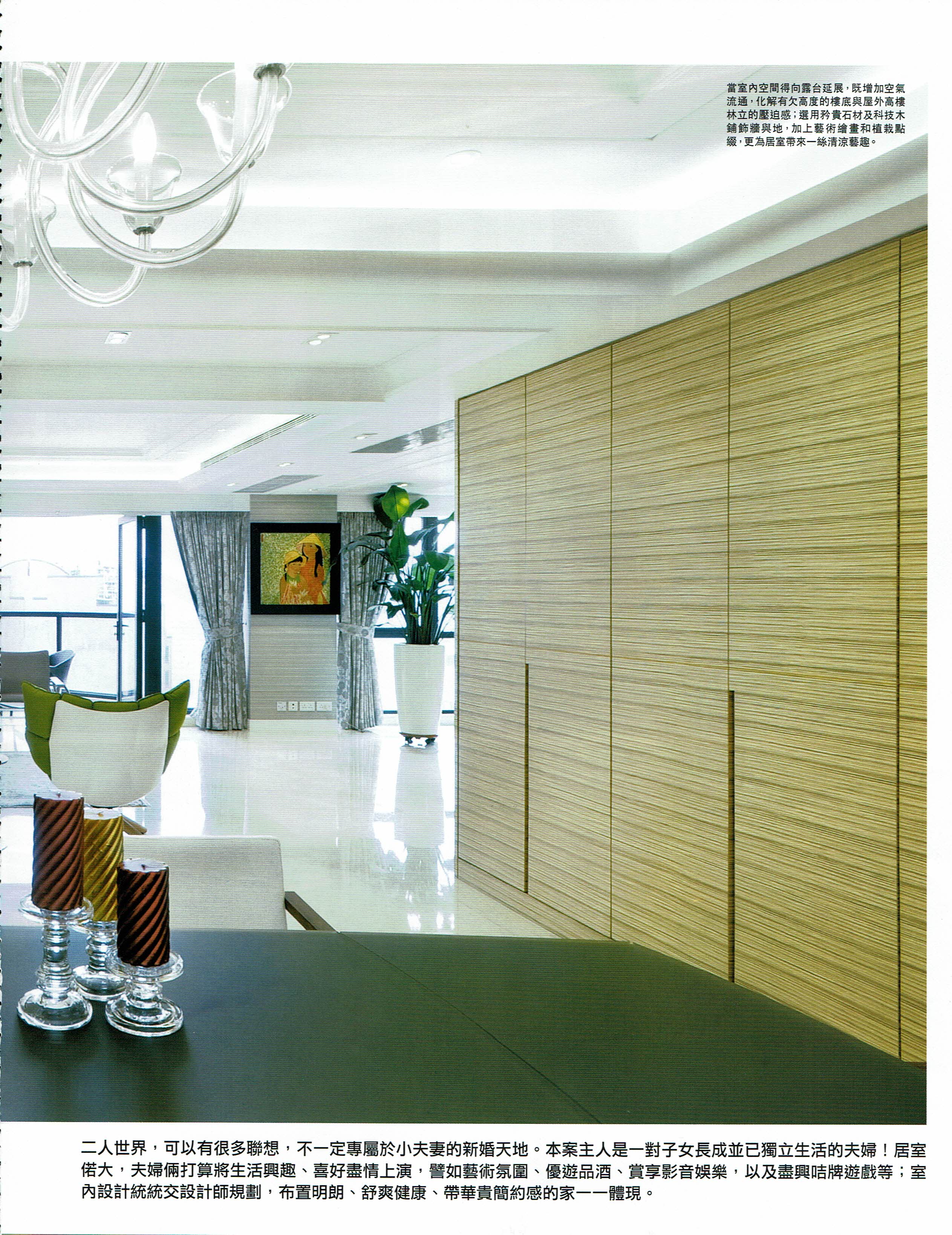 『簡約』不僅是一種室內設計的表現模式,箇中還關乎居者的生活習慣、態度與空間的互動關係。本案戶主夫婦一向喜歡簡單、整潔的居住環境,是次請來設計師Ron 籌劃新居設計,基本要求就是簡約、時尚,對一向擅長這類設計風格的設計師而言,自然處理得游刃有餘,最難得的是彼此在合作過程中互相信任,令設計師得以自由發揮之餘,家具飾品等配置亦可達致完美的組合效果,盡顯簡約神髓。
