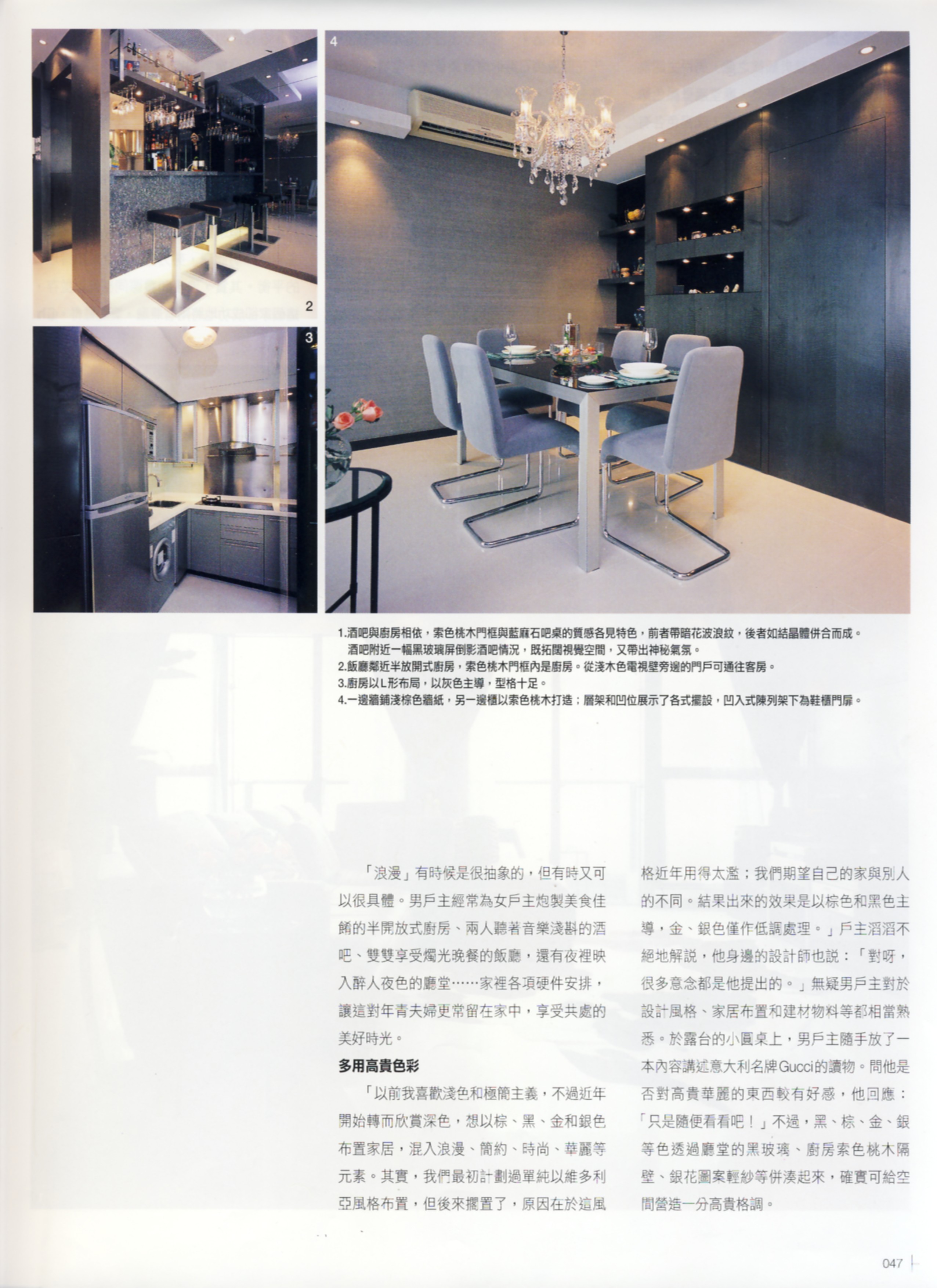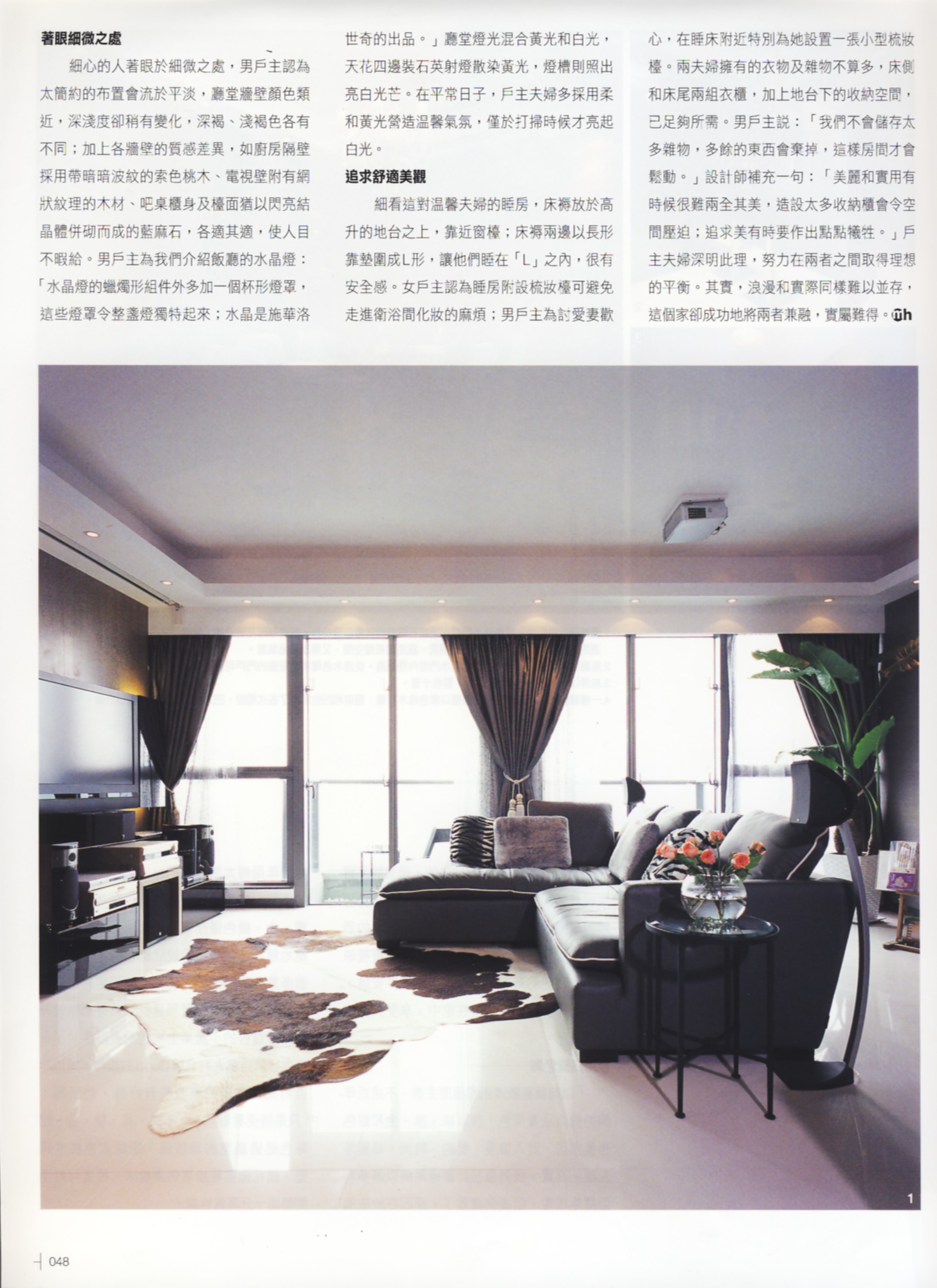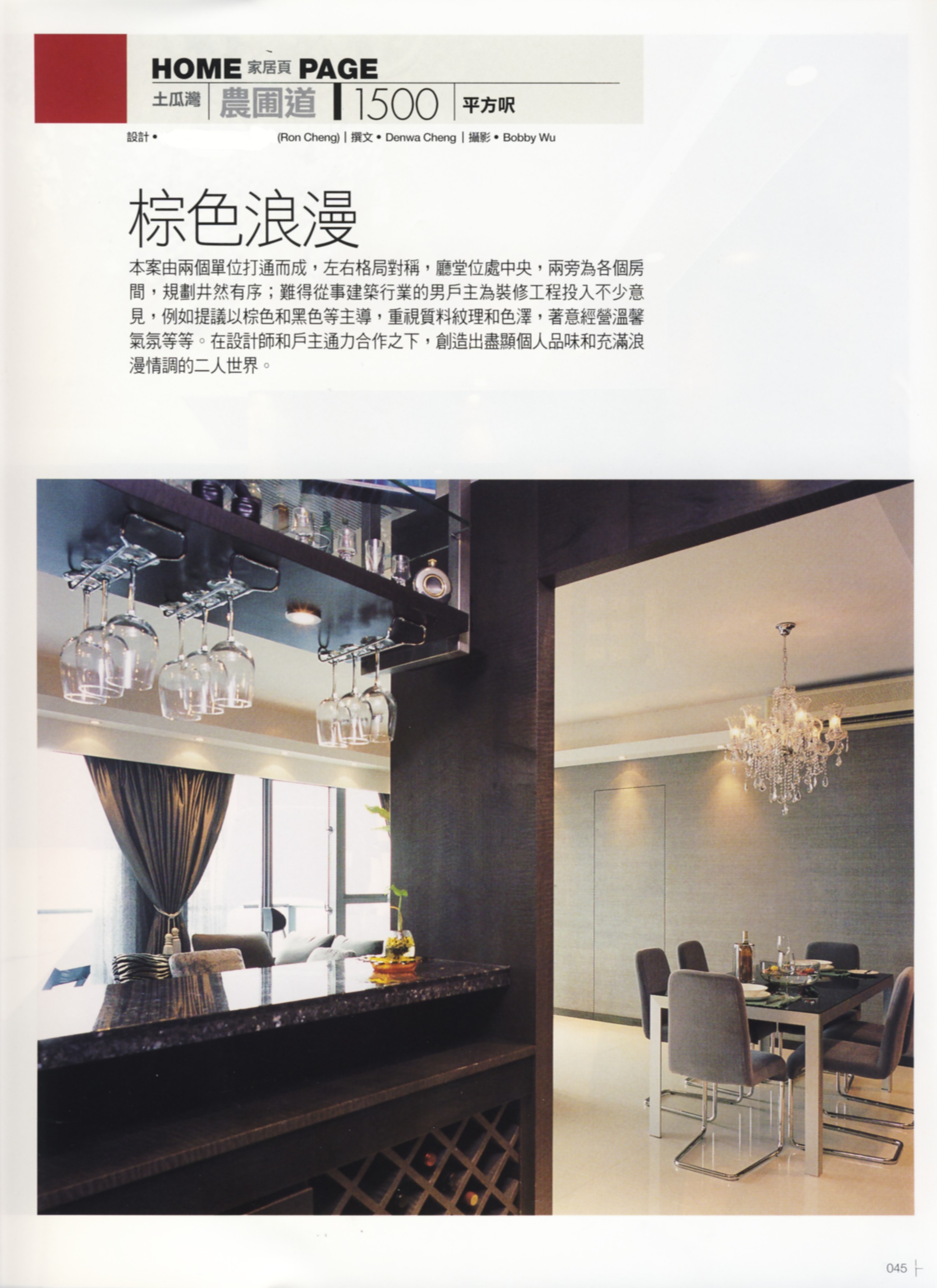 本案由兩個單位打通而成,左右格局對稱,廳當位處中央,兩旁為各個房間,規劃并然有序;難得從事建築行業的男戶主為裝修工程投入不少意見,例如提議以棕色和黑色等主導,重視質料紋理和色澤,著意經營溫馨氣氛等等。在設計師和戶主通力合作之下,創造出盡顯個人品味和充滿浪漫情調的二人世界。