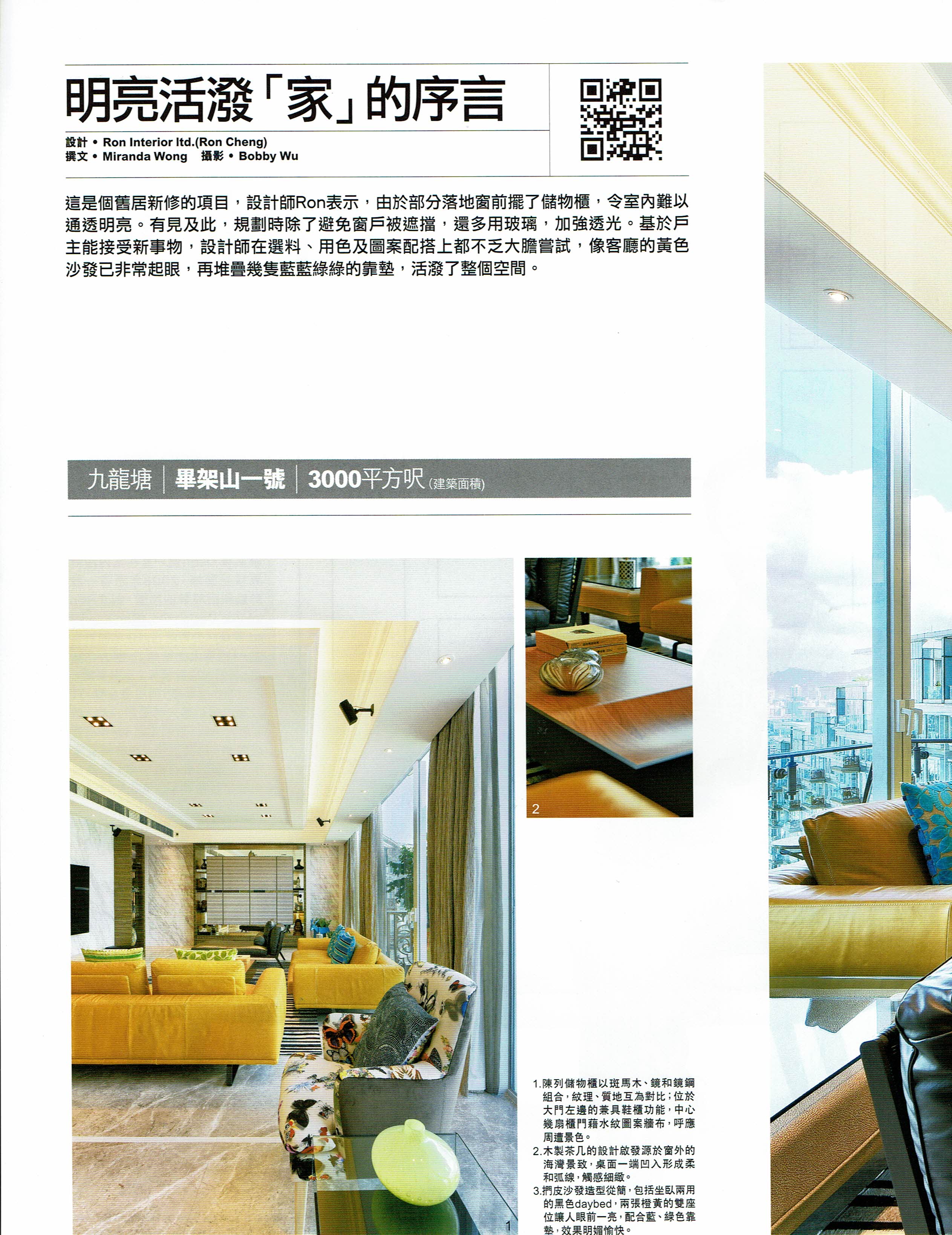 有見及此,規劃時除了避免窗戶被遮擋,玩多用玻璃,加強透光。基於戶主能接受新事物,設計師再用了,用色圖案配搭上都有不乏大膽嘗試,將客廳的黃色沙發已非常起眼,在堆疊幾隻藍藍綠綠的靠墊,活潑了整個空間。